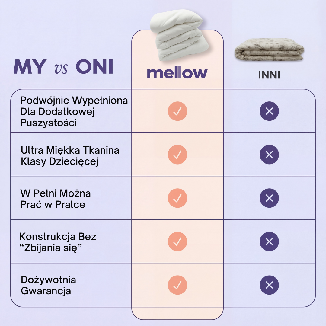 Większość kołder z czasem opada lub się zbija. Mellow ma podwójne wypełnienie i materiał klasy A, który utrzymuje puszystość, miękkość i idealną temperaturę przez cały rok. Daje uczucie spania w „chmurce” – każdej nocy.